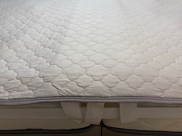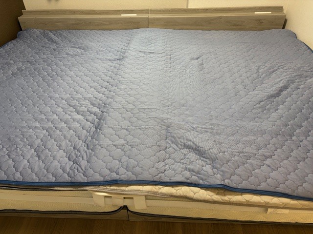 隙間は「隙間パッド」で埋め、上からダブル2台分を覆える「ファミリーサイズの敷きパッド」を敷いています。