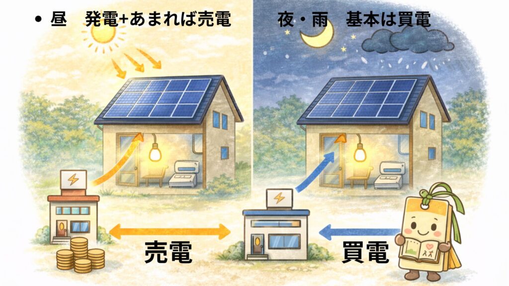 太陽光だけだと昼は発電できても、夜は電力会社から買う必要があります。