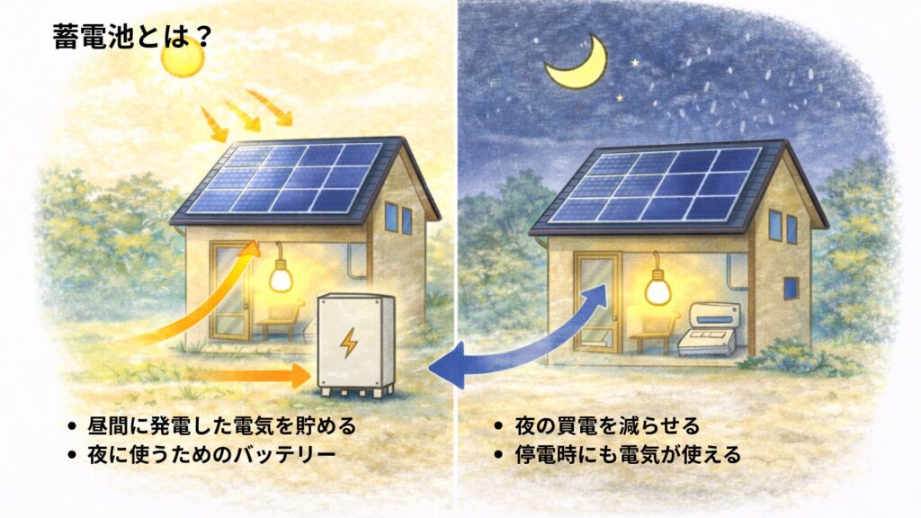 - 夜や災害は蓄電池で備えられる